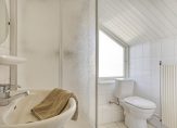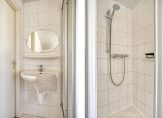 – badkamer met douchecabine, wastafel en toilet.