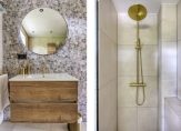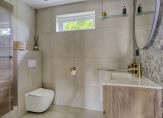 – badkamer met inloop douche, wastafelmeubel, hangend toilet en vloer verwarming.