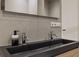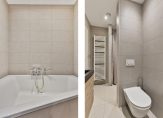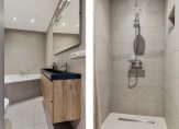– moderne badkamer met hoekbad, inloop douche, badkamermeubel met dubbele wastafel en hangend toilet.