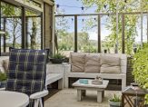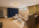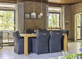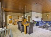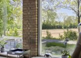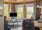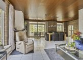 – riante woonkamer met grote raampartijen, open haard en schuifpui naar het terras;